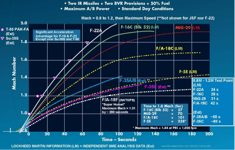 하지만 모든 무장을 기체내부에 탑재하도록 설계된 F-22나 F-35는 클린상태의 기동성이 실전상태의 기동성과 타 기체에 대비 비슷하다는 말이 된다. 즉, F-22와 타 기체의 차이는, 그래프로 보여지는 차이보다 실전에서 더욱 큰 격차가 벌어진다는 뜻이다.