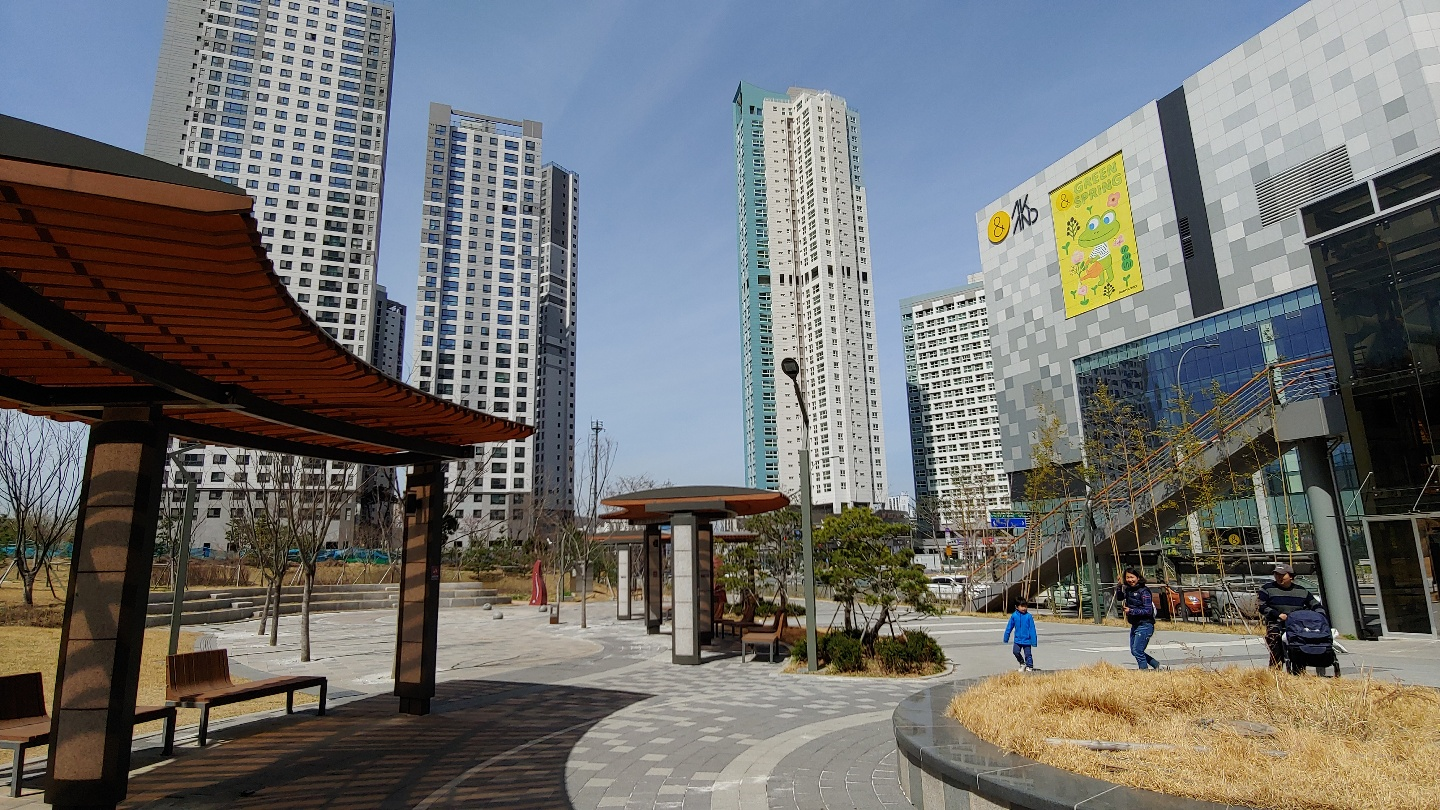 아직 정오 이전의 이른 시간이라 공원에 사람들이 평소처럼 많지는 않았다. 오후 2~3시쯤 되면 더 북적대겠지. 오른쪽의 지웰 푸르지오. 아파트 외관이 참 깔끔하다. 내 스타일이야..