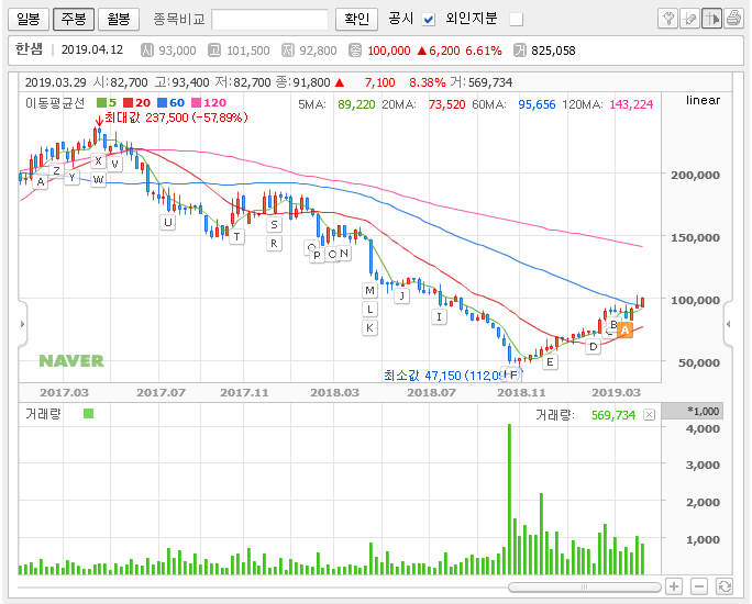한샘의 주봉이다. 2016년 30만원 이상의 주가를 보이던 한샘이 부적절한 사내 이슈와 실적 악화, 공매도, 개인들의 탈출 등 쿼드러플 이상의 악재로 엑소더스가 일어나 4만 원대까지 떨어졌었다. 내가 처음 한샘에 관심을 가진 시기이다