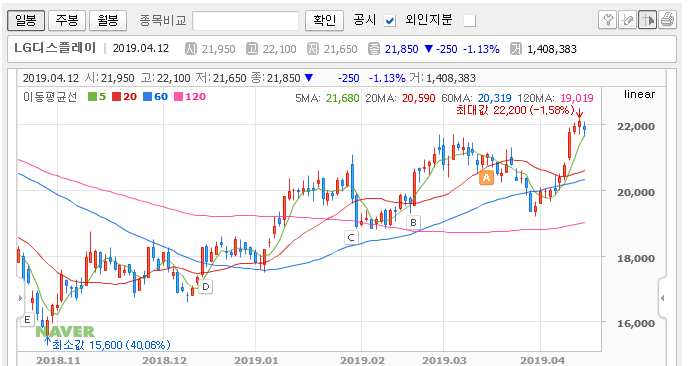 한샘은 매도주문을 낼 생각이 없다. 그럼 다음 종목도 준비해야 하는데 그 종목이 LG디스플레이이다. LG디스플레도 마찬가지로 한샘과 비슷한 관점을 가지고 접근했고, 최소 투자기간은 1년으로 잡았다. 19300원에 첫 매집을 시작했고, 조정이 들어올때마다 적금처럼 사모을 예정이다.