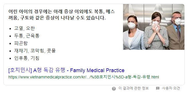 잠도 깊게 못잤다. 일어나니 머리가 깨질 것 같았다. 열 때문인지 다리 근육통도 그대로고, 그래도 6시간 넘게 자고 일어났음에도 불구하고 피로감이 몰려왔다. 특히 눈에 극심한 피로감이 몰려와서 눈을 뜨고 있기조차 힘들어 오후 4시 정도까지 누워있었다. 그리고 머리에 진동이 오면 두통이 심해지더라. 우리 딸이 겪던 A형 독감 증상과 비슷하다. 그래서 A형 독감의 증상을 찾아보니,