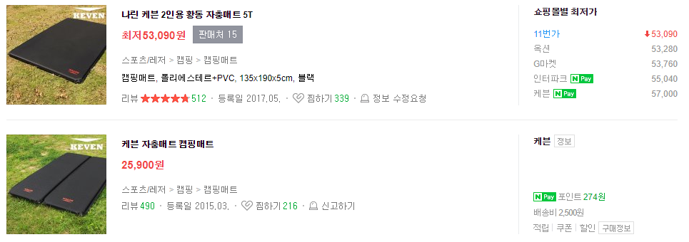 몇 개월째 만족하며 쓰고 있으니 초보 캠퍼들은 일단 자충매트를 먼저 사보자. 두께는 5T면 충분하다. 나는 그냥 상품평이 대체로 좋고 후기의 수도 상당히 많은 케븐 자충매트 2인용 5T 버전을 믿고 구입하였다.