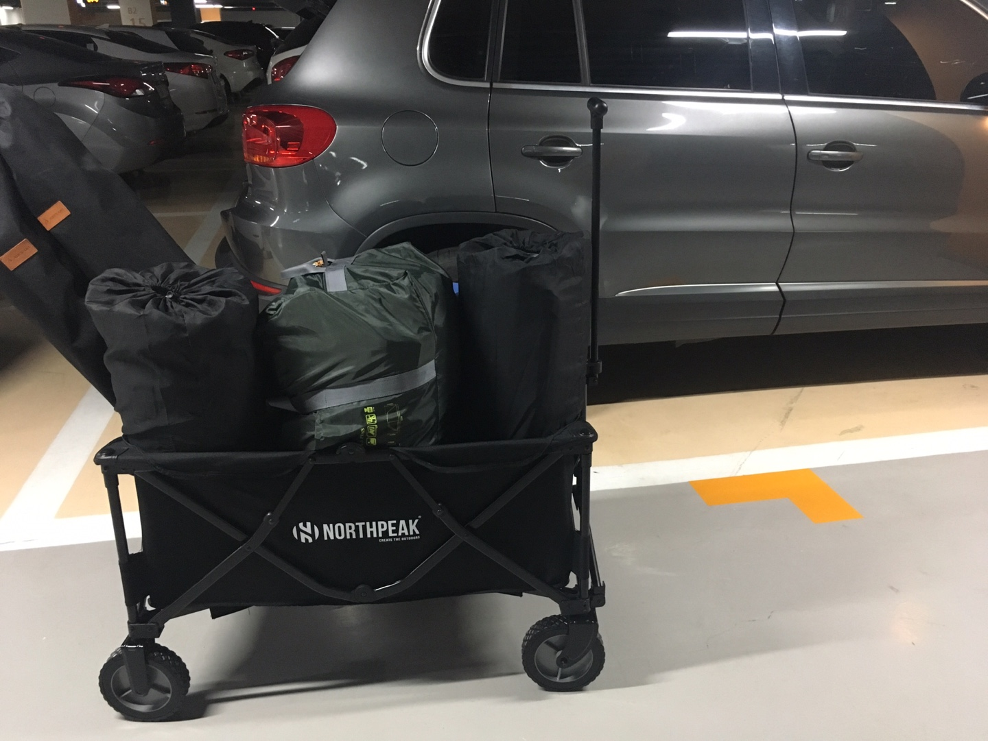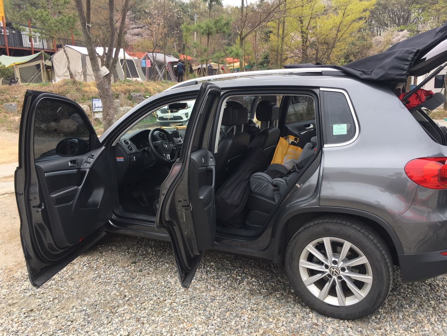 다행히 우리 집은 미니멀한 캠핑을 추구하고 있어(과연 미니멀한지는 모르겠지만) 스노우라인 미라클 패밀리 텐트, 작은 화로, 아이스박스 30L, 조립식 테이블, 전기 릴선, 자충매트 2개, 백팩 1개, 릴렉스 체어 2개, 어린이 체어 1개, 더플백2개, 전기장판 1개, 캠핑웨건 1개 정도 밖에 짐이 없어 수납공간이 별로 넓지 않은 차임에도 불구하고 짐이 다 들어가고도 좀 남는다. 오늘은 여기에 20kg 쌀까지 싣고 왔다.
