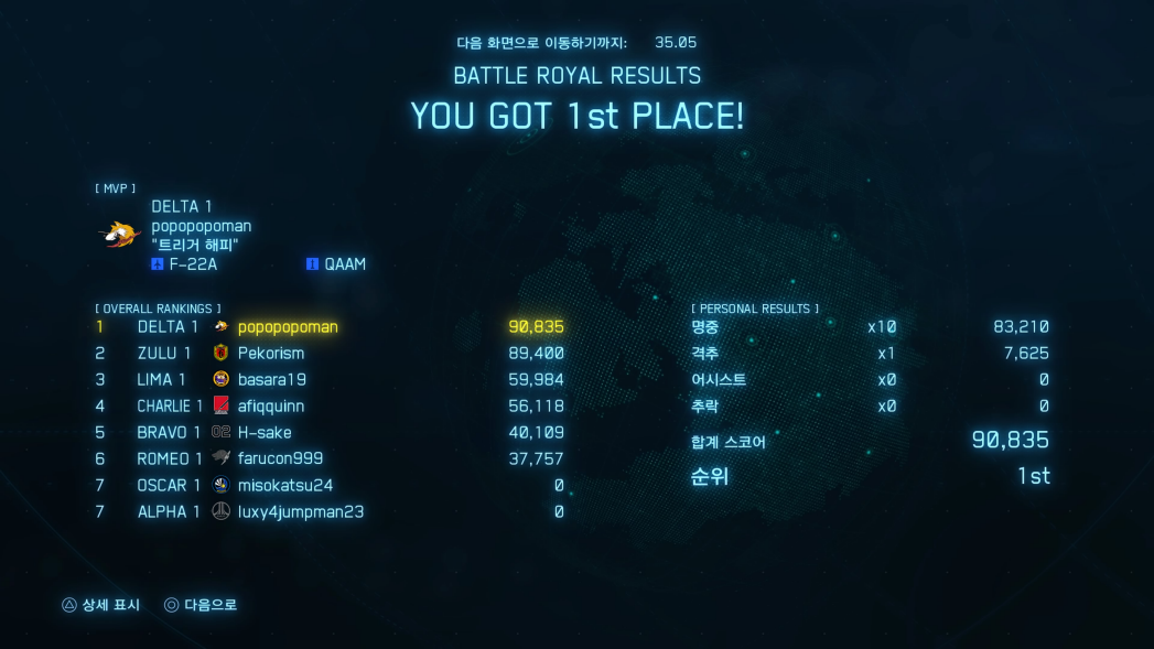 그런데 이렇게 트로피를 따느라 싱글플레이를 열심히 했더니, 에이스컴뱃7의 꽃인 멀티플레이 실력이 자동으로 올라갔다. 매번 F-22나 X-02의 스샷이나 찍어대던 내가 어느 순간부터 멀티플레이 결과 스샷만 찍어대고 있었다.