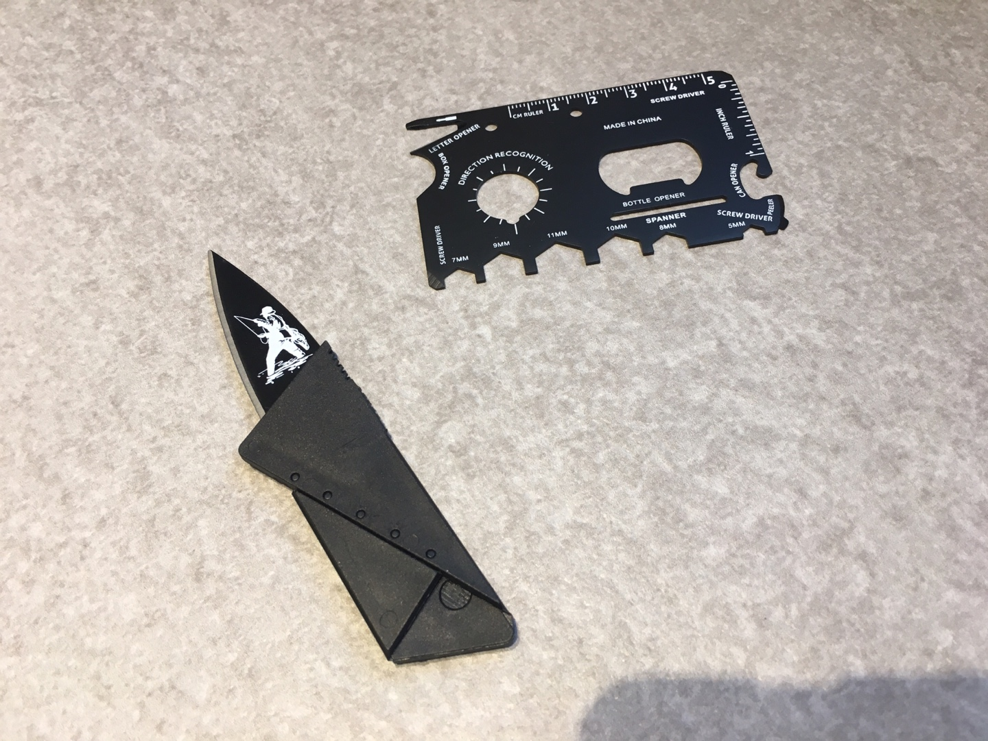 지난주와 지지난주 캠핑때 전혀 필요하지 않았던 것 같긴 한데, 괜히 보니까 사야 할 것 같았다. 2,500원으로 몇 종류의 칼과 캔 오프너, 병 오프너, cm/inch자, 원형 자, 드라이버, 나비 렌치, 6각 렌치를 모두 얻었다. 어차피 오토캠핑을 다니니 그냥 둘 모두 차에 넣어놓아도 될 것 같다.
