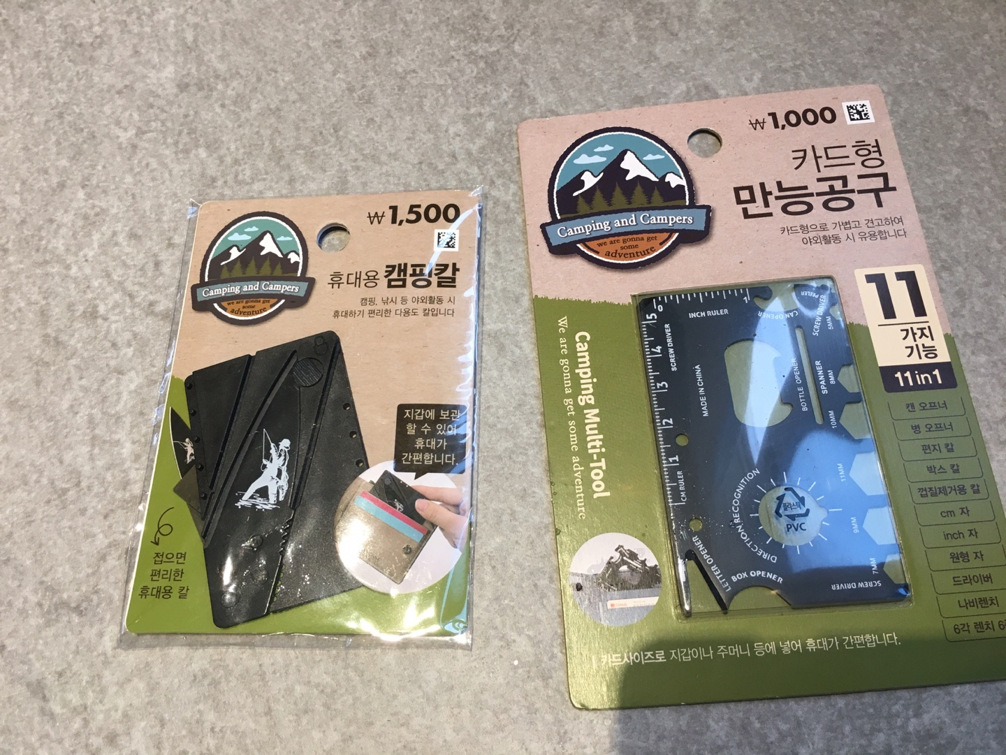 다이소에서 캠핑용품까지 파는 줄 몰랐다. 캠핑을 본격적으로 다니기 시작하니 보이지 않던 것들이 보이기 시작한다. 기흥역 AK 지하 1층의 다이소에서 캠핑 때 구비하고 있으면 좋을 것 같은 쓸만한 물건 두 개를 집어왔다. 휴대용 캠핑칼과 카드형 만능공구이다. 둘 모두 지갑에 넣고 다녀도 될 정도로 얇게 나왔다.