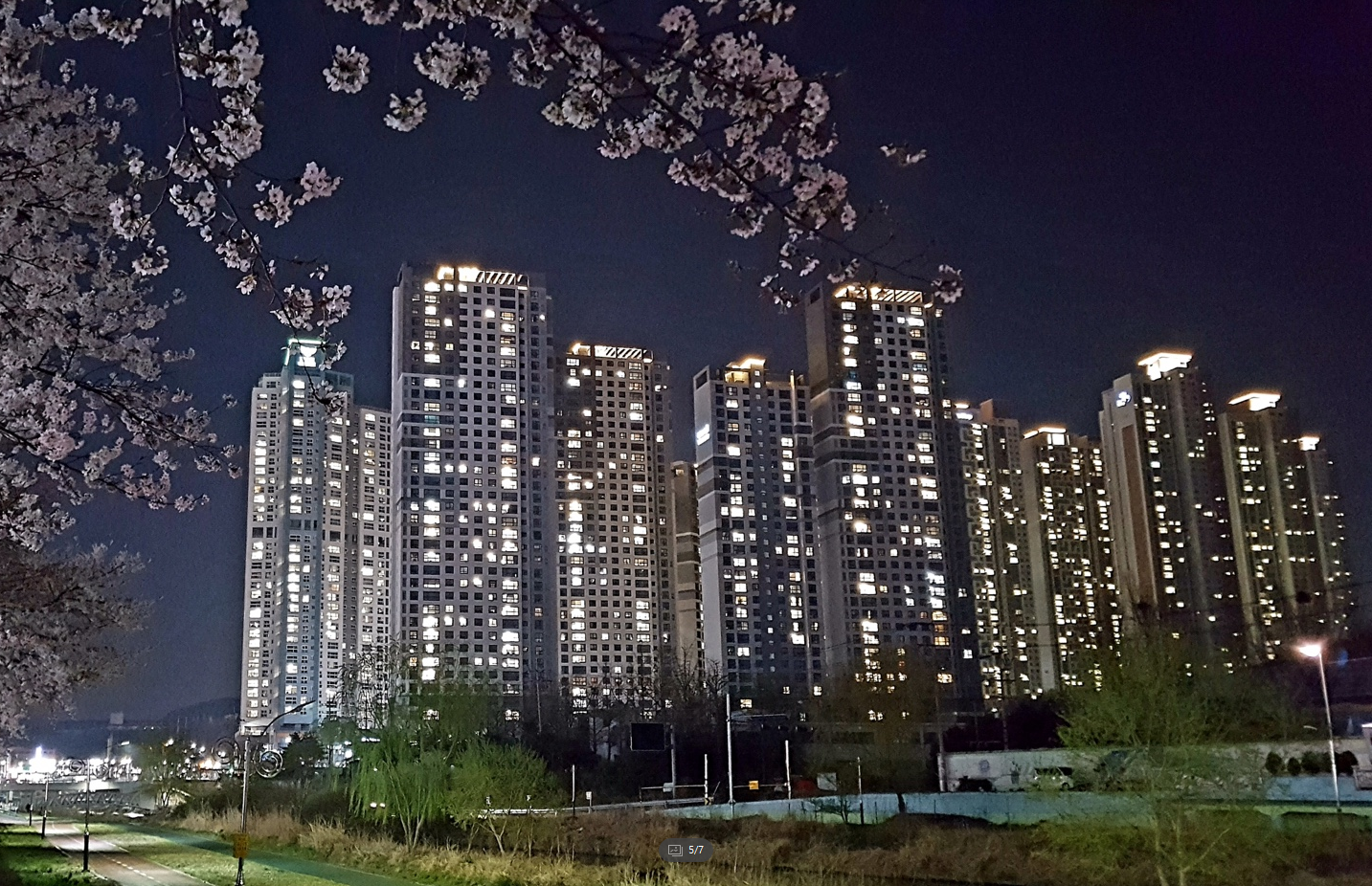 벚꽃이 핀 밤의 기흥역세권 사진. 신갈천 어디에선가 찍은 것 같다. 예쁘다.