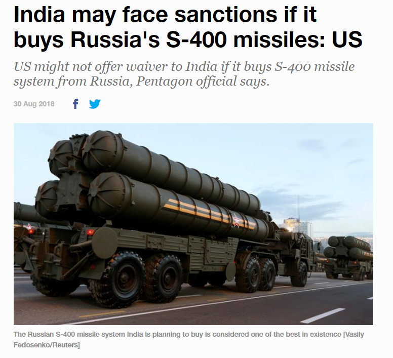 여러 정치적 이유로(미국 대선 개입, 우크라이나 문제) 러시아를 제재하고 있는 미국은 러시아산 무기를 수입하는 나라에 대해 제재 대상이 될 수 있다고 꾸준히 엄포를 날리고 있다. 미국은, 인도의 S-400 도입에 대해 계약 체결 전부터 '인도는 전략적 선택을 하라'며 도입 철회 압박을 했었다.