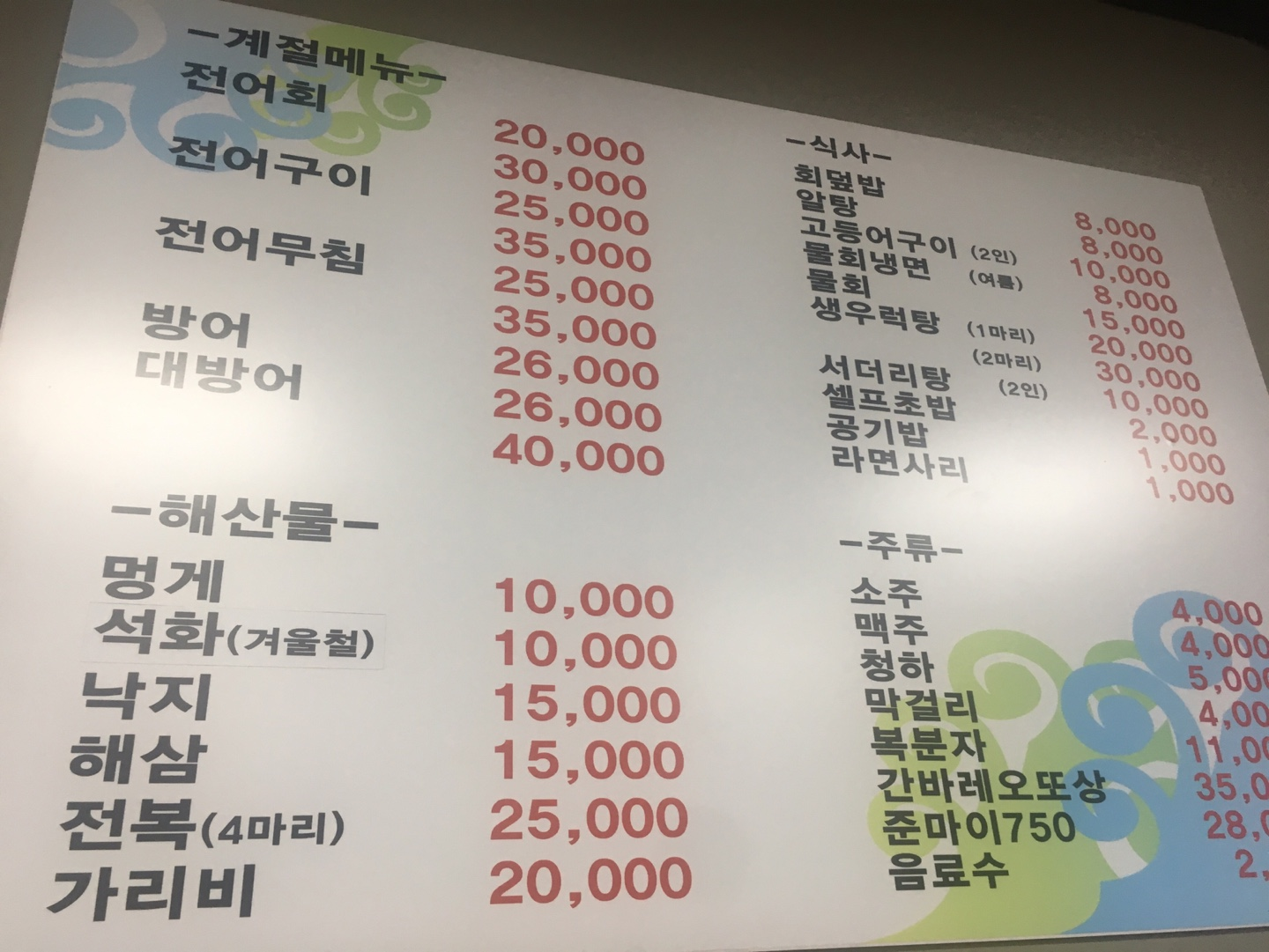 맞은편 건물에 주차를 하고 1층으로 올라갔다. 매장 앞 수족관에 생선이 적당히 많았다. 회가 싱싱하고 가성비가 좋다고 해서 간건데 과연?