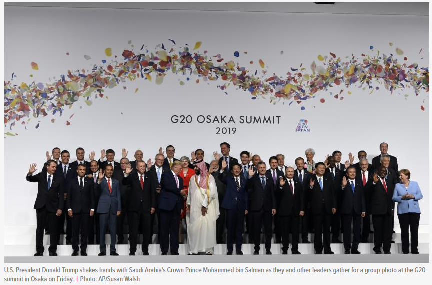 2019년 G20 OSAKA SUMMIT의 사진 한 장. 모든 정상들이 카메라를 보고 손을 흔들고 있을 때, 트럼프는 사우디 왕자와 악수를 하려 한다. 저 형은 역시 범상치 않다.