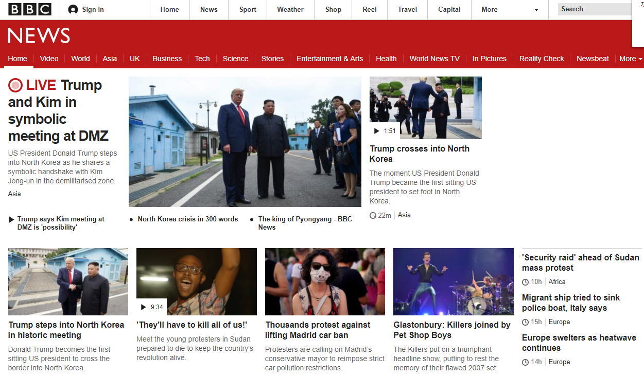 영국의 BBC 홈페이지 역시 트럼프와 김정은의 DMZ 만남을 메인페이지에 다루고 있다. G20 따위는 잊은지 오래다. 메인페이지에 일본이나 오사카선언 따위는 이미 없다.