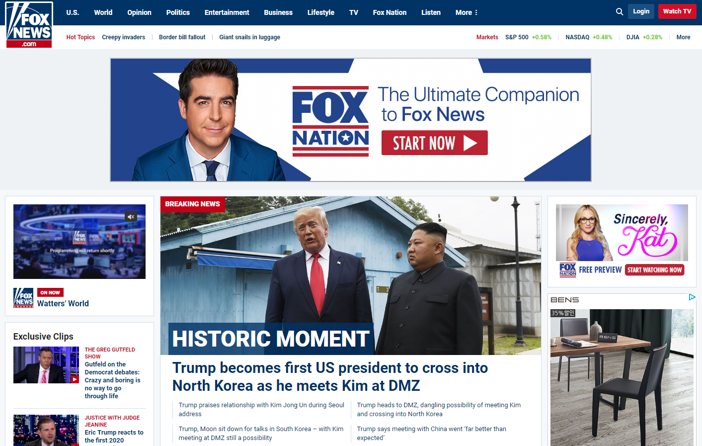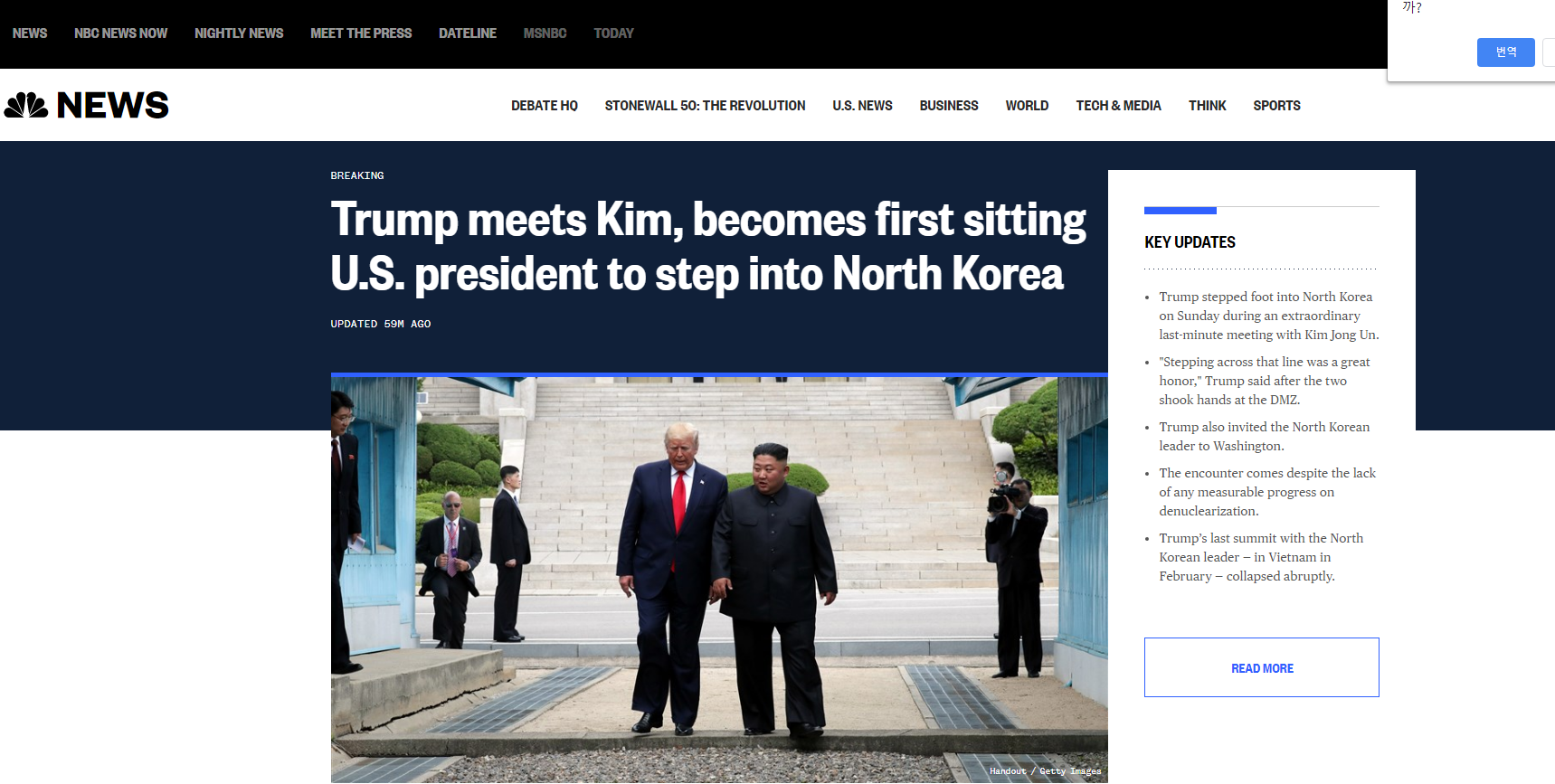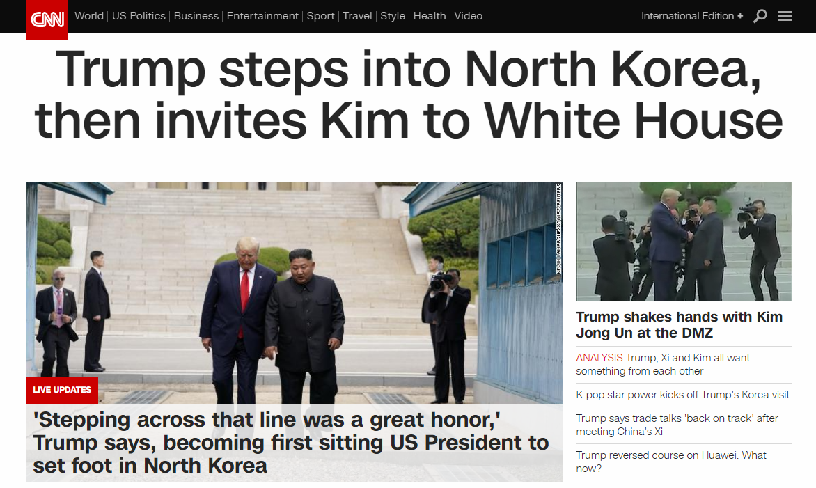 미국의 폭스뉴스이다. 트럼프가 DMZ를 넘어가 그쪽 대장을 만난 첫 미국 대통령이라며 헤드라인을 꾸몄다.