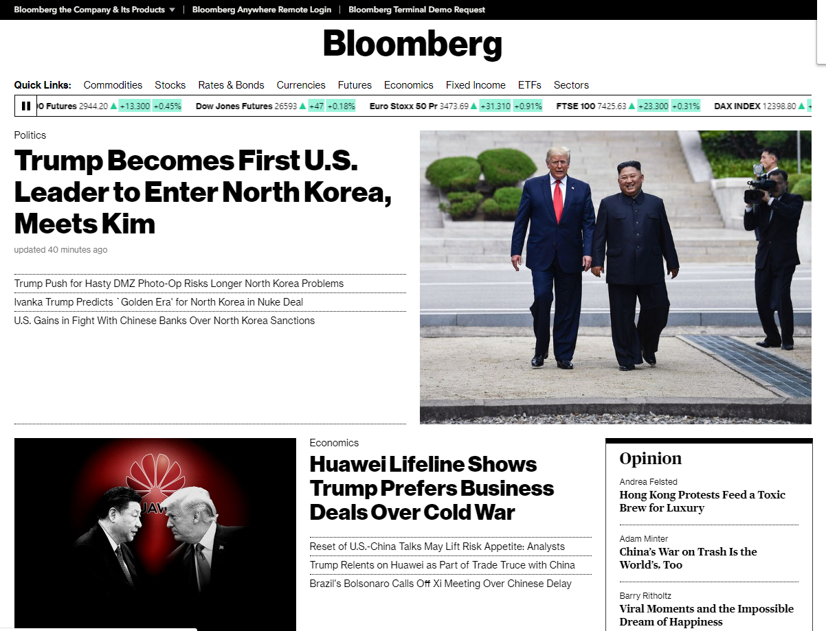 블룸버그, APF, CNN, FOX, BBC, NBC, NHC 등 전 세계 주요 언론사 DMZ, 판문점에서 진행된 북미만남을 대서특필하고 있다는 것을 확인할 수 있다. 알맹이가 전혀 없었던 G20은 이미 기사의 메인에서 내려간지 오래.