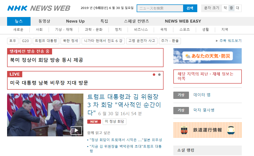 일본의 NHK도 아무런 성과가 없었던 G20 따윈 잊어버림. 라이브로 북미정상회담을 보여주고 있고 트럼프-김정은의 사진이 메인이다.