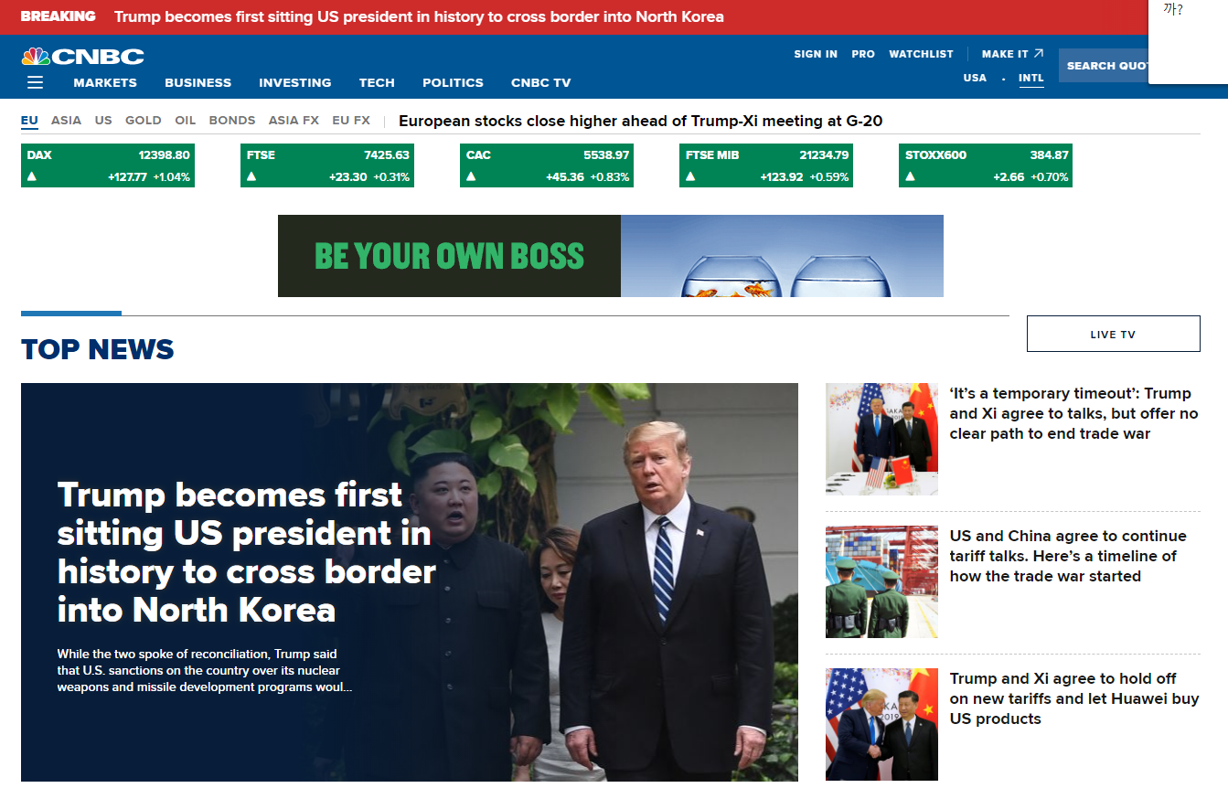 NBC와 CNBC의 메인도 트럼프-김정은의 만남이 헤드라인이다. 미-중 만남은 뒤로 밀려남. G20은 이미 없음.