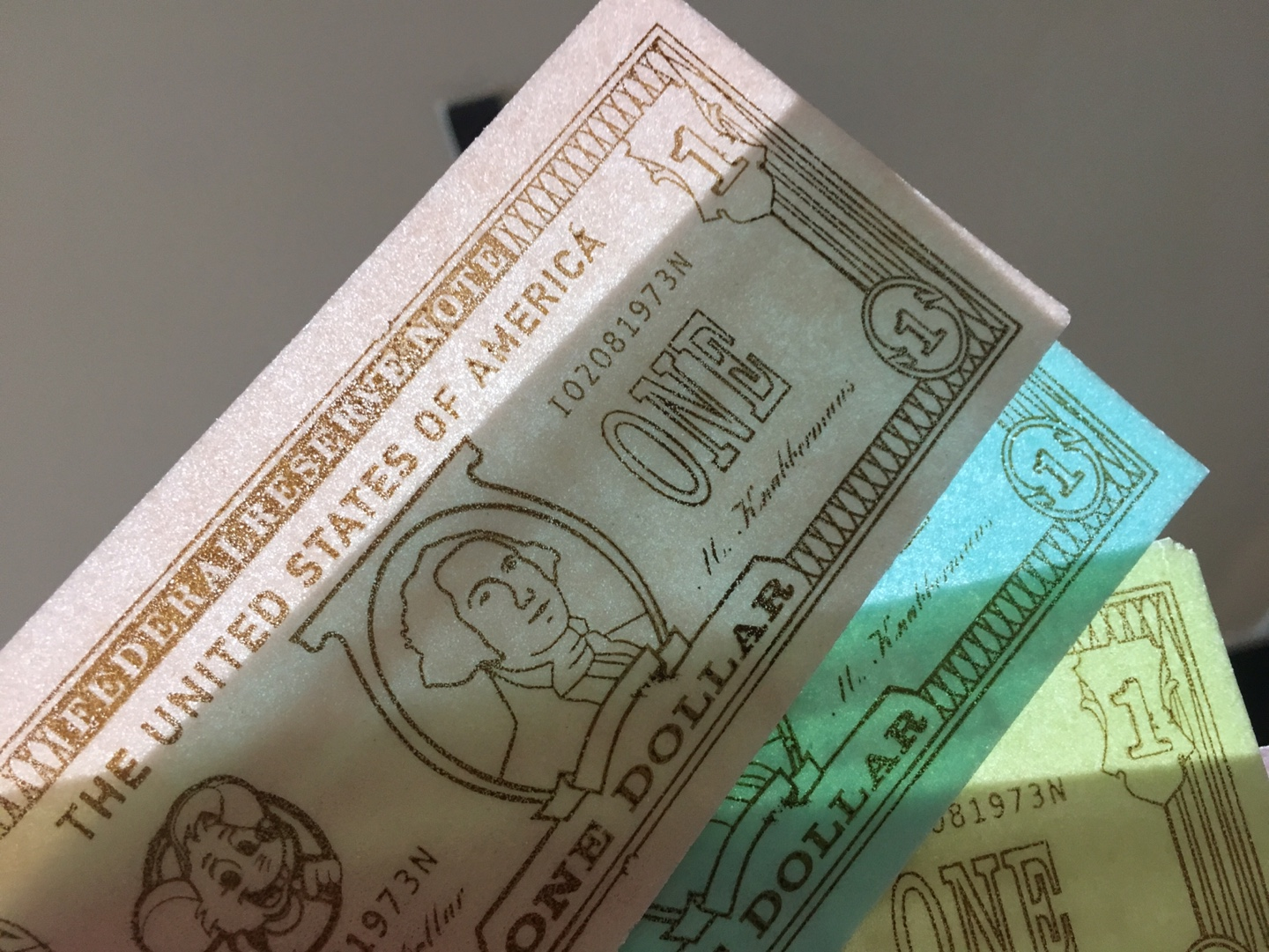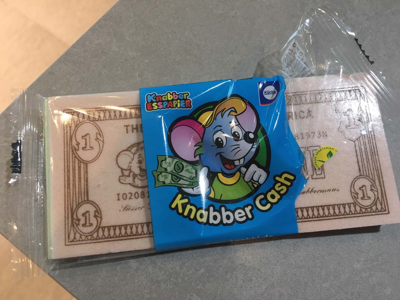 혹시 위조지폐 검사 기믹이 탑재되어있을가 싶어 불빛에 비춰봤는데 아무것도 없었다. 이것까지 있으면 대박인데 ㅋㅋ 먹는 지폐에 들어있는 돈은 모두 화폐의 시리얼이 똑같다. I02081973N인데, 아마도 KNABBER라는 회사의 설립년도가 아닐까? 궁금하지 않으므로 알아보지 않겠다.