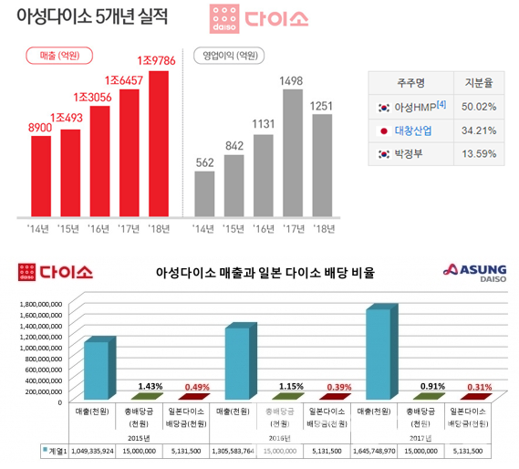다이소에서 번 돈의 일부가 배당을 통해 일본으로 흘러들어가긴 하지만 배당이 그렇게 크지 않다. 2015년부터 2017년까지 일본 다이소에 지급된 배당금이 51억 3150만원인데, 이는 총 배당금인 150억에서 일본 자본의 지분율을 반영한 배당액이다.