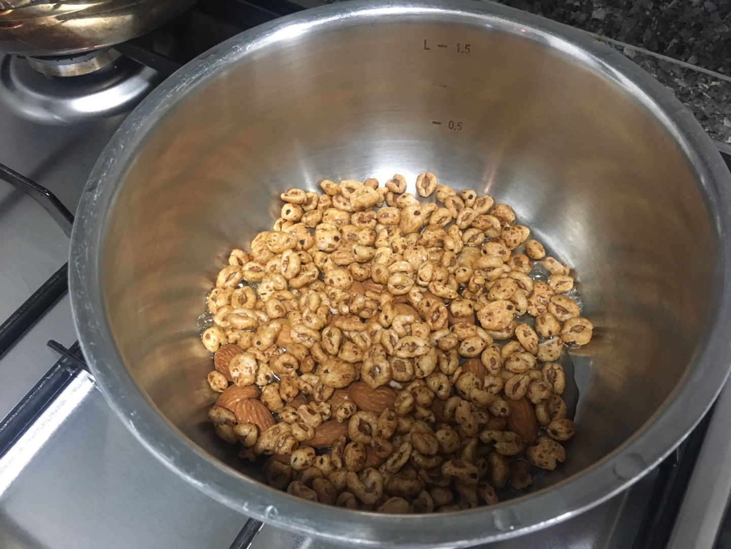 지난번엔 견과류만 가지고 집에서 강정을 만들었었다. 그런데 견과류만 사용하면 몇가지 문제가 발생하는데 첫번째는 비용이 매우 올라가는 것, 두번째는 하루 견과류 권장 섭취량을 가뿐히 넘어서는 것, 세번째는 좀 딱딱하다는 것이다. 그래서 이번엔 부드럽게 만들어보고자 뭔가를 첨가하기로 했는데, 그 주인공은 가장 쉽게 구할 수 있는 '죠리퐁'