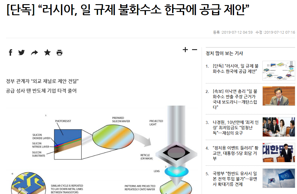 아베 정권의 반도체 관련소재 수출규제에 의해 공급이 중단되고 있는 초고순도 불화수소(고순도 불산, HF)를 우리의 '불곰국' 러시아에서 공급하겠다는 의사를 타진해왔다. 이를 처음 보도한 곳은 한겨레. 한겨레 기사를 보면 러시아산 불화수소가 일본보다 순도가 높다고 나오는데 이는 진실일까? 팩트체크를 해보자.