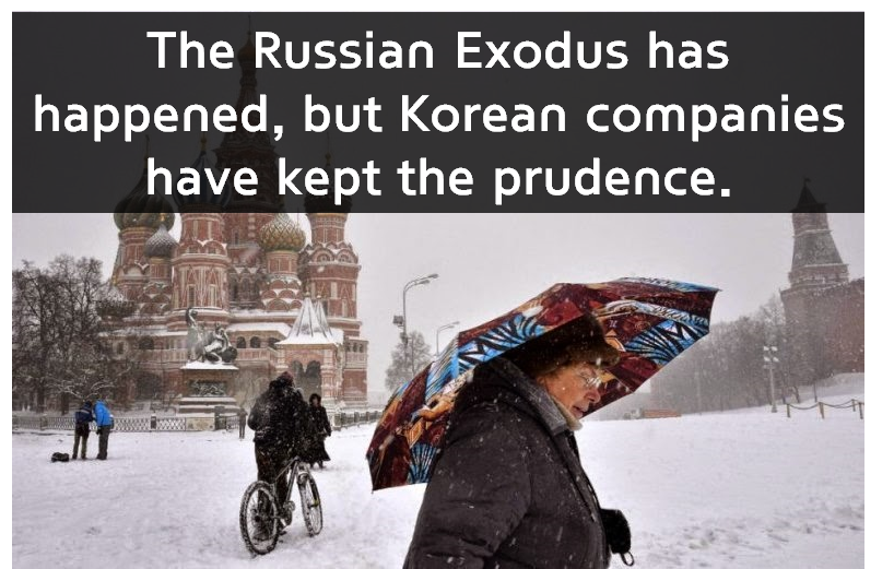 이때 우리나라의 삼성전자, LG전자, 현대차그룹은 오히려 위기를 기회로 활용한다. 환율에 맞춰 가격을 조정하고 마케팅을 강화하여 탈러시아를 선언한 기업들의 마켓 쉐어를 가져왔다. 삼성전자는 현지 생산공장까지 그대로 유지하였다. 그래서 러시아 쪽에선 한국 기업들은 '의리'를 지키는 기업으로 인식하고 있다.
