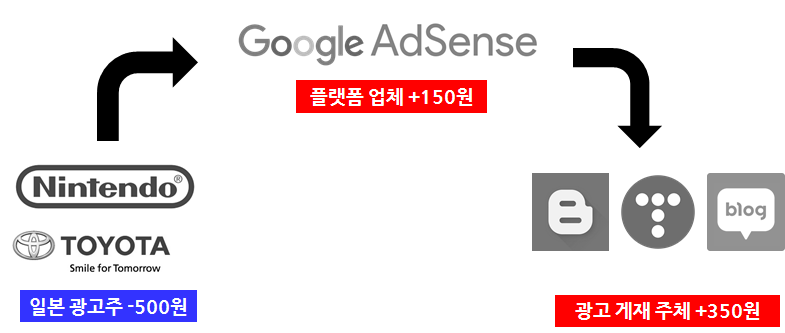 그럼 우리는 그 광고들을 클릭하면 된다. 클릭하고 안사는 것은 일본 광고주에게 직접 타격이 가는 아주 효과적인 방법이다. 클릭을 할 경우 건당 몇백 원이 일본의 광고주에게서 빠져나가 일부는 구글 애드센스와 같은 광고 플랫폼 기업으로 가고 일부는 해당 페이지를 운영하고 있는 홈페이지 주인이나 블로그/유튜브의 계정으로 들어간다. 보다 이해하기 쉬운 아래 그림을 보자.