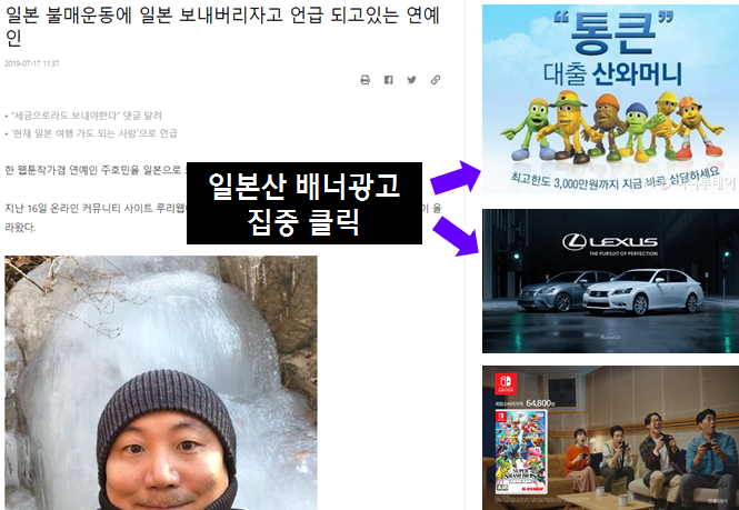일본 물건 자체를 사지 않는 것, 매장 앞에서 시위를 하는 것도 방법이지만 이런 방법도 있다는 것을 알리고 싶었다. 렉서스, 토요타(도요타), 닌텐도, 소니, 유니클로 등의 광고가 나오면 많이 클릭해주자.