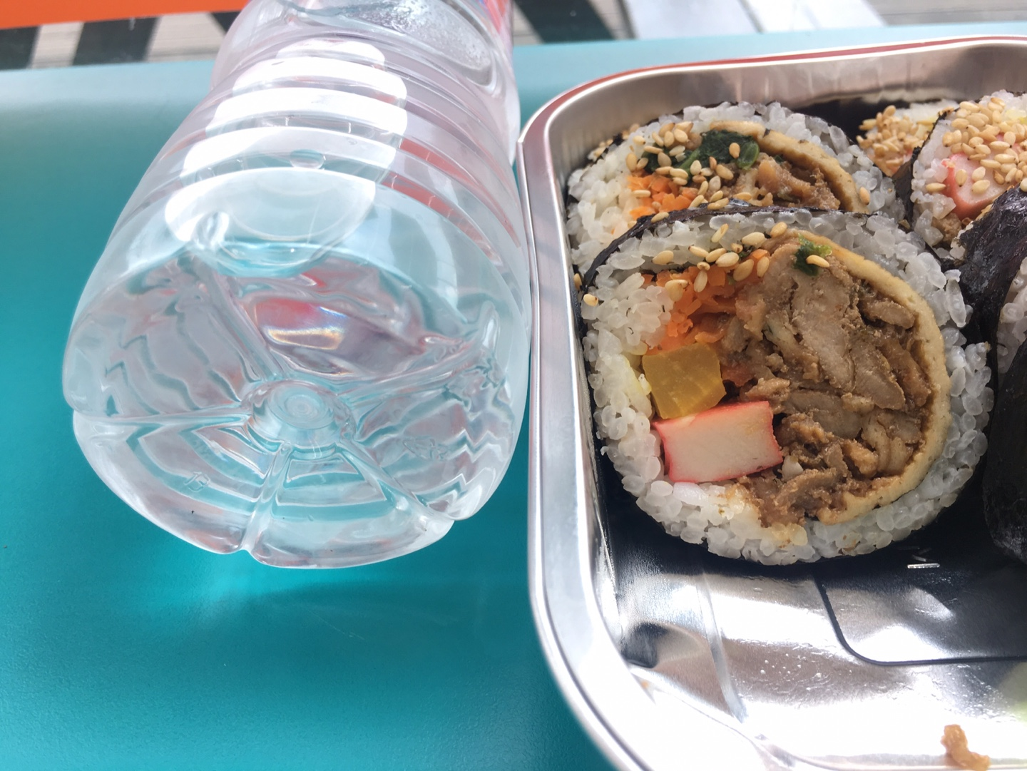 김밥 옆에 생수통 500ml 짜리를 놔봤다. 김밥 직경이 더 크다. 이건 진짜 왕이다. 왕김밥 맞다. 숯불고기왕이라는 네이밍이 딱 맞다. 어우 밤 11시에 김밥을 다시 보니 배가 고프네. 맛도 진짜 맛있다. 저 단무지 맛살 어묵 아주 그냥 통으로 집어넣었다. 고기도 200g은 넣은듯 ㅋㅋ 미친 왕김밥. 이거 하나만 먹어도 배가 부르니 다른 건 사지말자. 한끼를 완벽하게 대체할 수 있다.