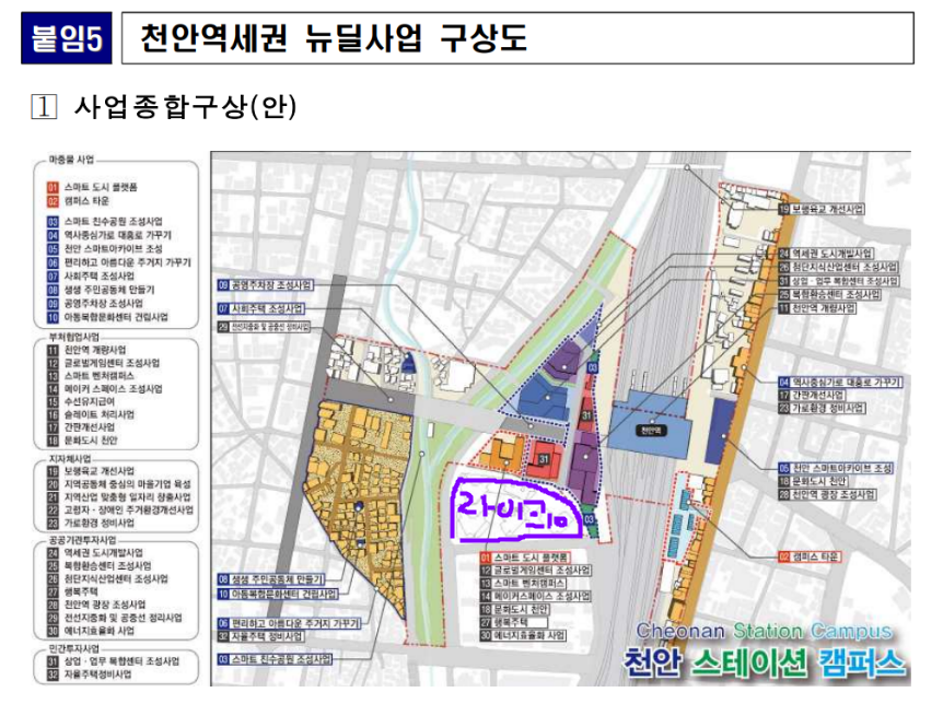 서부역은 그 고물상을 비롯한 낙후지역이 있고 동부역은 유흥가 및 골목상권이 있다. 동부역에서 조금 더 걸어가면 신세계 백화점(야우리) 및 천안 최고의 번화가가 나온다. 이 일대에 도시재생 뉴딜사업을 한다는 것. 그런데 1조의 사용처를 보니 동부의 동남구청 일대 재개발(건축)에 2,800억을 사용하고, 서북구의 라이크텐 일대에 6,800억원을 들여 새롭게 변모시킨다는 것이다.
