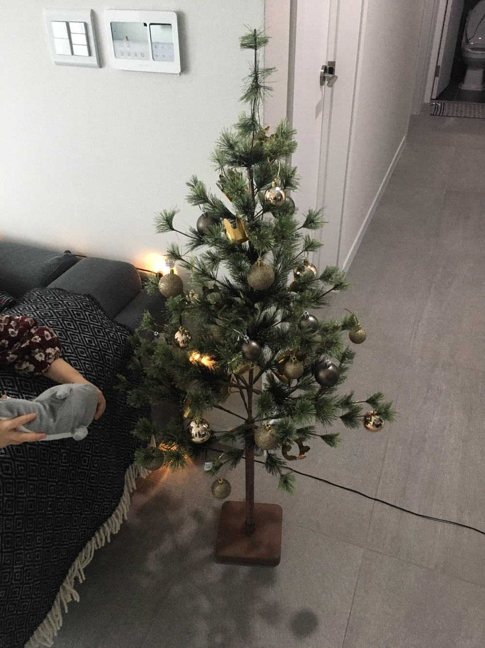 그리고 집안에 있던 온갖 크리스마스 관련 소품들을 매달음. 와이프가 자주에서 사온 500원짜리 인형들과 강원 속초 한화리조트 소라노에서 주워온 솔방울, 또 원래부터 있었던 빨간 장식 몇개를 붙이고 4년째 잘 쓰고 있는 모던하우스에 사온 산타별을 제일 위에 올려놓았다.