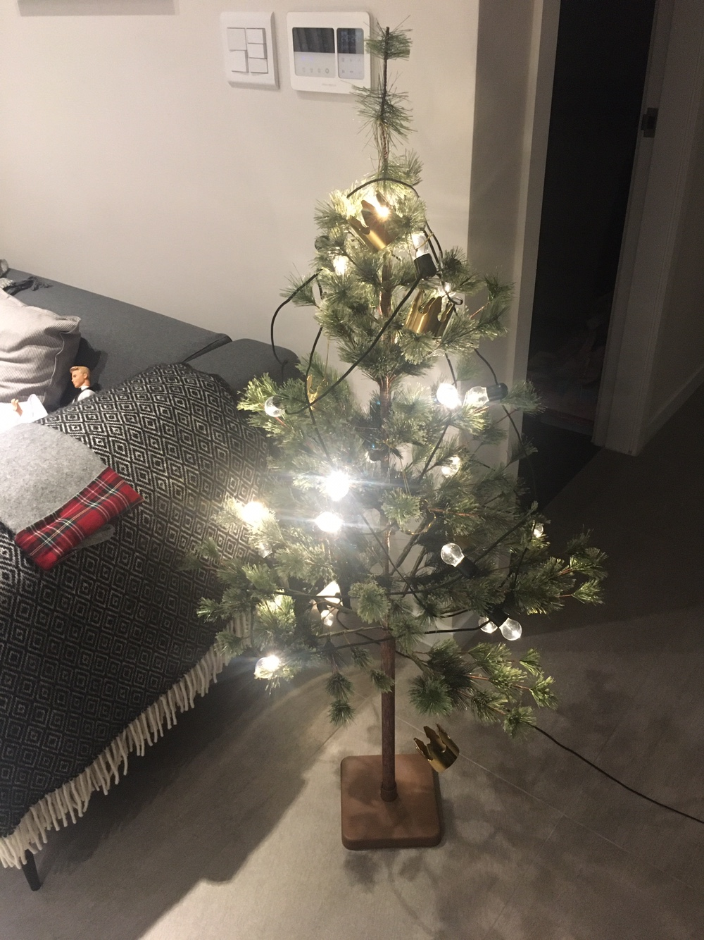 왕관들을 대충 트리에 걸고 집에 원래부터 있던 앵두 전구를 대충 칭칭 감아봤다. 전구 줄이 너무 두껍고 검어서 악마에게 결박된 나무같지만 그래도 느낌이 있다.