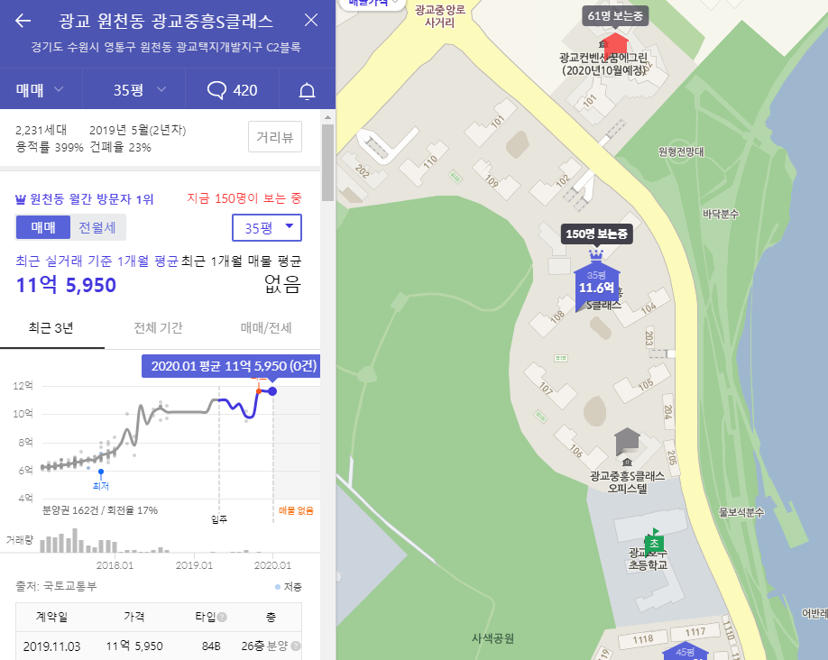 11.7억이 오버슈팅이냐 아니냐의 논란이 있긴 하지만 전 개인적으로 이정도 가격에 걸맞는 가치를 지니고 있다고 판단합니다. 경기권 신분당선 역세권의 대장이었던 광교신도시의 중흥S클래스의 가격과 비교해보면 납득이 가는 시세입니다.