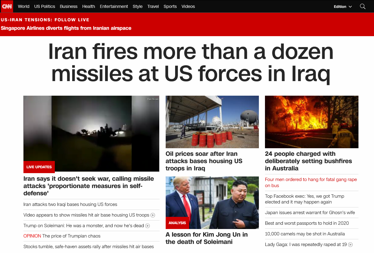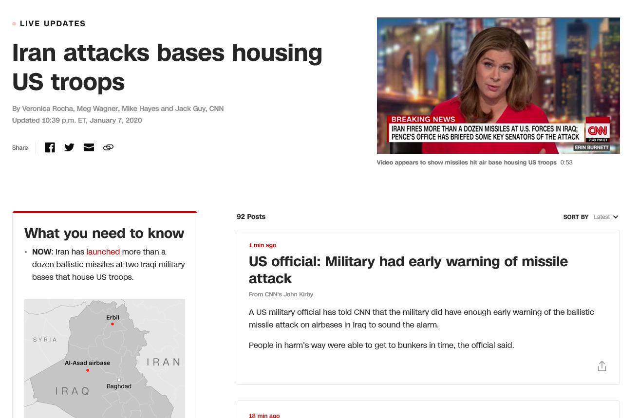 아래는 1월 8일 오전에 돌았던 찌라시입니다. 역시 찌라시는 믿지 말아야 겠습니다. 이란이 쏜 미사일은 맹지 혹은 미국 군인들이 모두 떠난 후의 캠프에 떨어지고 그랬네요. 결국 사망자는 0.