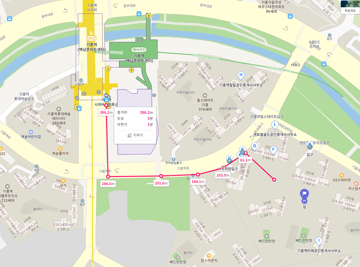 대중교통을 자주 이용해야 하는 저도 좀 편했으면 좋겠고 초등학교에 다녀야 하는 아이도 편했으면 좋겠습니다. 기흥역 센트럴푸르지오에선 지하철, 버스, 한얼초등학교가 모두 평등하게 도보 5분입니다. 203-204동 사이의 후문을 이용하여 한얼초까지 가면 됩니다. 후문으로부터 393m 가량 걸어야 하는데 인도가 아주 잘 되어있습니다. 적당히 운동도 하고 좋네요.