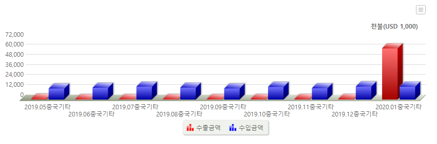 ▶ 중국으로의 수출 중량이 2019년 12월 대비 40배 이상 증가하였고, 수출금액은 전월대비 100배 증가하였습니다. 2019년 1월과 비교해봐도 중량 30배 이상, 금액 60배 이상 증가하였네요.