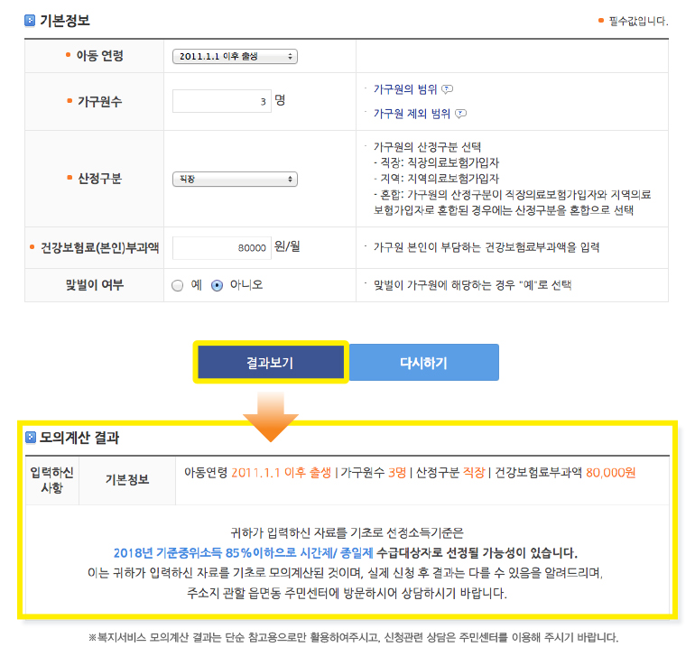 5. 대략 20xx 기준중위소득 xx% 어쩌구저쩌구라고 나오며 모의 계산을 해줌