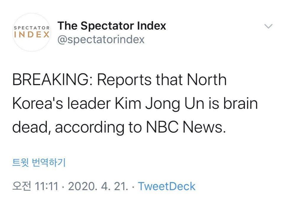 작년말부터 들리던 소문 및 돌던 찌라시가 꾸준히 회자되네요. 북한 김정은 국무위원장의의 건강이 너무 안좋다는 것과 그리고 이미 사망하였을 수 있다는 찌라시가 꾸준히 있었는데 오늘 아침 CNN발 속보로 중태설이 떴습니다. NBC에서는 뇌사 키워드까지 넣어서 속보를 띄웠나봅니다.