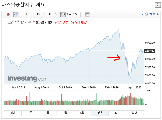 예측되는 변수들은 어차피 대응이 가능합니다. 코로나 사태도 비슷합니다. 실물경기가 셧다운 될 것을 예상하고 각국에서 총력 대응을 했죠. 미국의 나스닥 지수를 볼까요. 20년 2월에서 3월로 넘어가는 시기가 코로나가 세계에 이렇게 급속도로 퍼질지 예측을 못해서 발생한 진정한 의미의 폭락입니다. 지금은 단기 저점을 찍은 이후 전고점의 절반 정도를 회복한 상황입니다.(21년 5월 수정 : 현재 글로벌 주가 및 부동산은 대폭등)