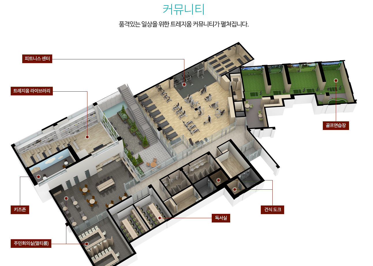 16년 이후 신축도 없었고, 두산위브 이후로 브랜드 신축 계획이 없네요. 커뮤니티가 있는 1군 대단지 첫 신축이 아닐까 싶습니다. 피트니스센터, 도서관, 키즈존, 회의실, 독서실, 골프연습장 등 기본 구성이 다 있네요.
