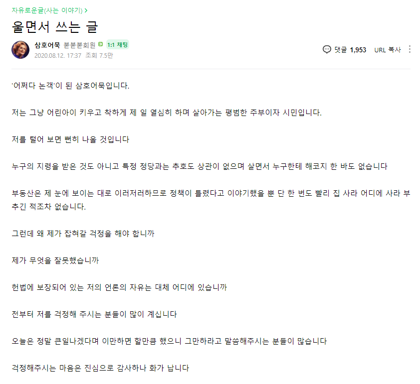 오늘 부동산스터디 카페의 유명인 삼호어묵님은 울면서 글을 쓰셨다고 합니다(아래 링크). 어쩌면 지금 이런 기사링크로 점철된 제 글도 단속대상이 될 수 있겠네요. 신체적인 물리적인 탄압 폭력보다 무서운게 이겁니다.