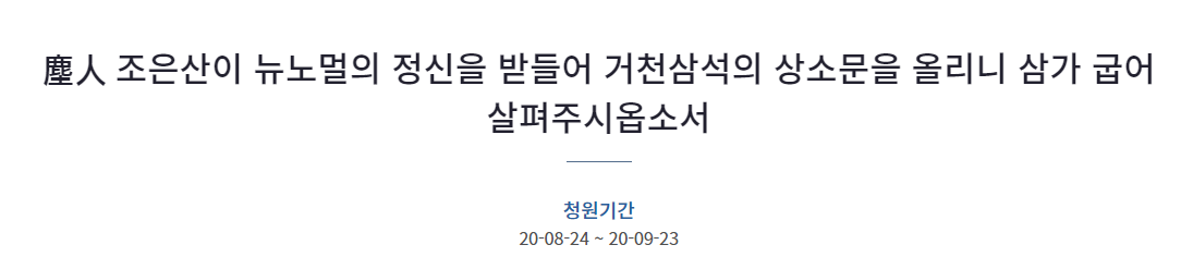 塵人 조은산이 뉴노멀의 정신을 받들어 거천삼석의 상소문을 올리니 삼가 굽어 살펴주시옵소서