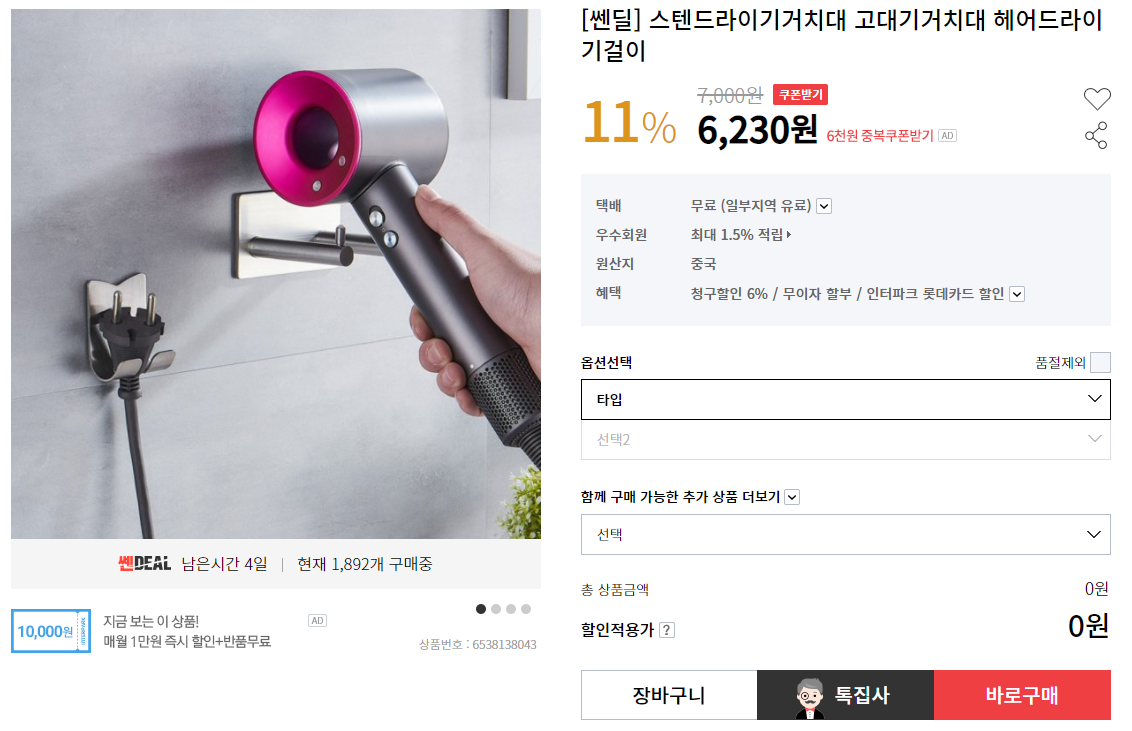 헤어드라이어를 욕실 젠트리(?) 위에 2년간 올려놨었는데 자꾸 떨어지기도 하고 영 불안하여 거치대 쇼핑을 하던 중 넘나 깔끔한 것을 봐서 구매했다.
