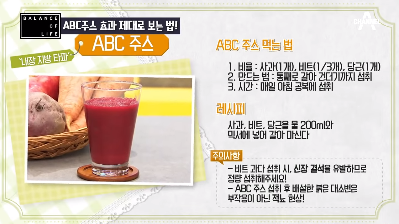 참고로 ABC주스의 효능과 복용 방법에 대해선 아래의 링크를 참조하세요.