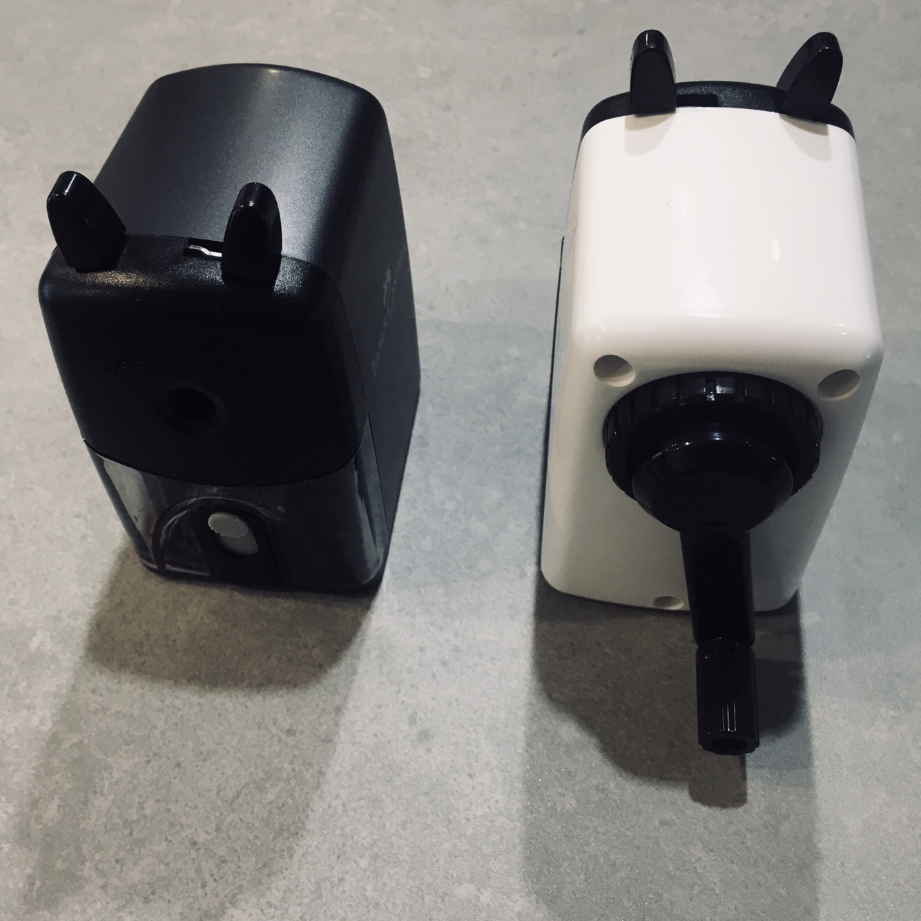 연필을 넣는 두 구멍 중 위에거는 긴 연필을 깎을 때 활용하면 되고, 아래에 흰색 커버는 몽당연필을 깎을 때 쓰면 된다. 몽당연필의 경우 그냥 손으로 잡아 돌려야 하니 힘이 많이 필요하다.