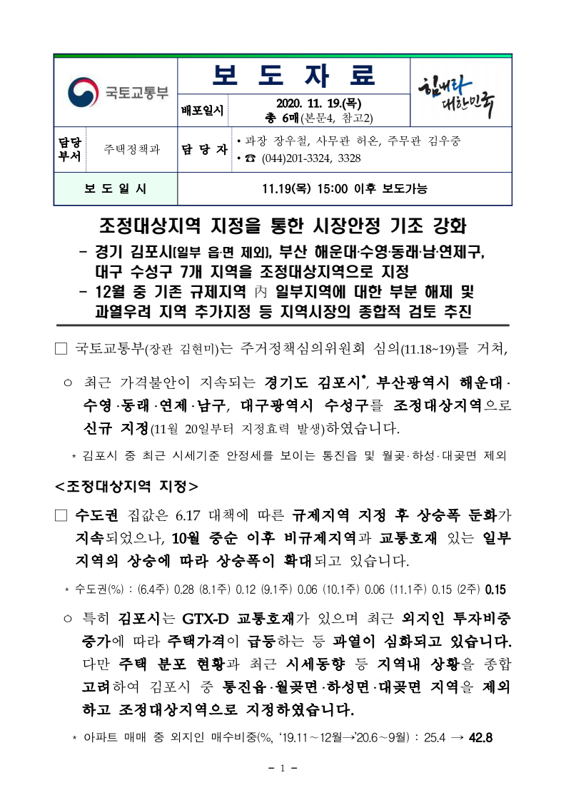 조정대상지역 추가 지정 확정 : 부산,대구,김포 (1120대책 보도자료 전문) 포스팅 끝