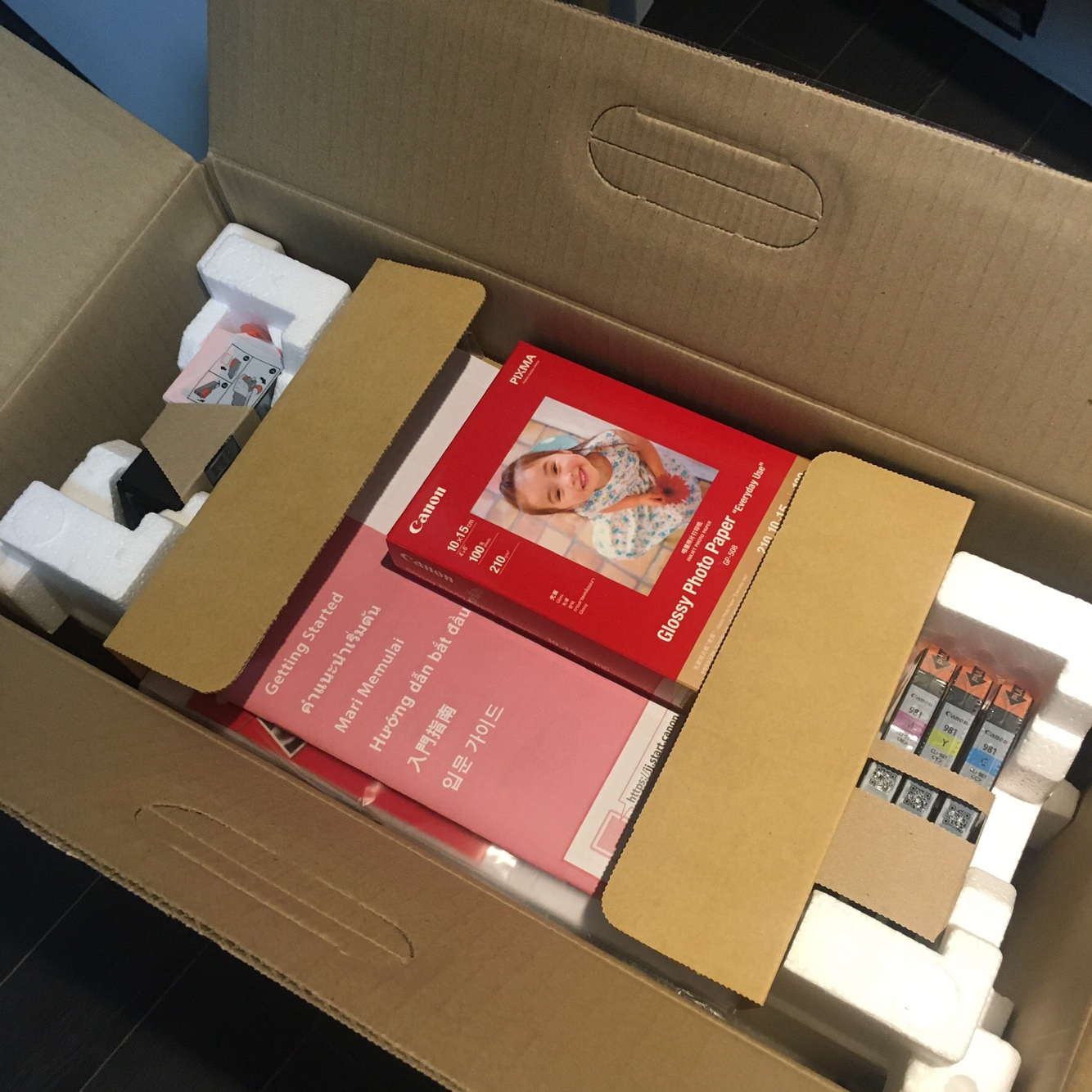 박스 안에 뭐 이거저거 참 많이 들어있다. 포토용지도 같이 주문했는데, 박스 안에 넣어져있더라. 박스 밀봉을 한번 풀었었나보다. 뭐 상관없다. 한가지 우려되는 점은 전자제품들이 다 그렇지만 뽁뽁이는 없고 스티로폼으로만 지지를 하고 있다. 그래서 택배를 집어던지면 제품에 문제가 생길 것 같은데.. 박스 자체가 프린터라고 티를 팍팍내고 있어서 택배상하차할때도 조심해서 다룰것 같긴 하다. 박스가 구겨진 곳 없이 칼박으로 온걸 보니 조심해서 다루나보다.