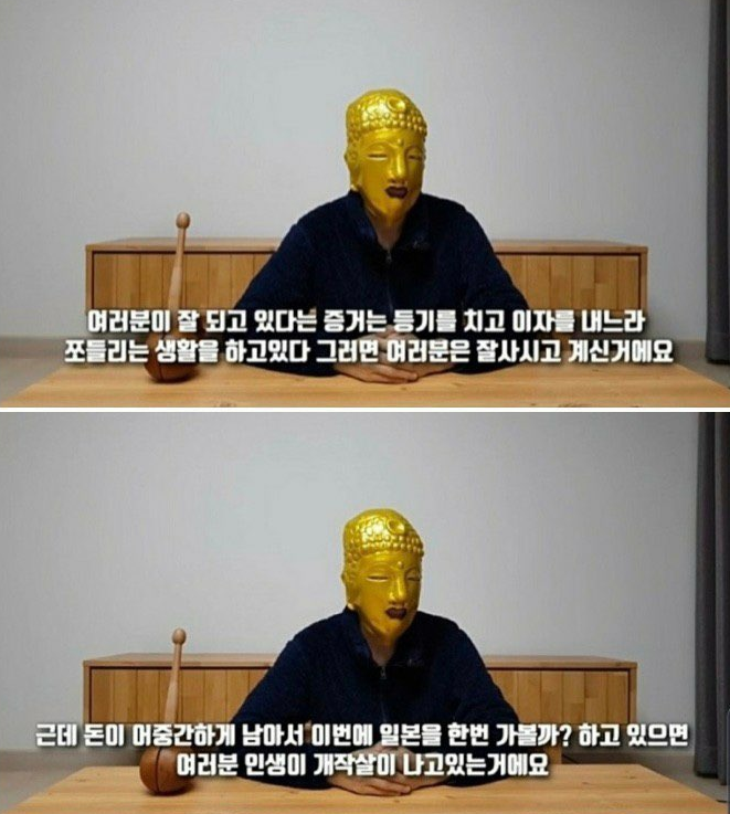 "여러분이 잘 되고 있다는 증거는 '등기를 치고 이자를 내느라 쪼들리는 생활을 하고 있다' 그러면 여러분은 잘사시고 계신거에요. 근데 돈이 어중간하게 남아서 '이번에 일본을 한번 가볼까?' 하고 있으면 여러분 인생이 개작살이 나고있는거에요."