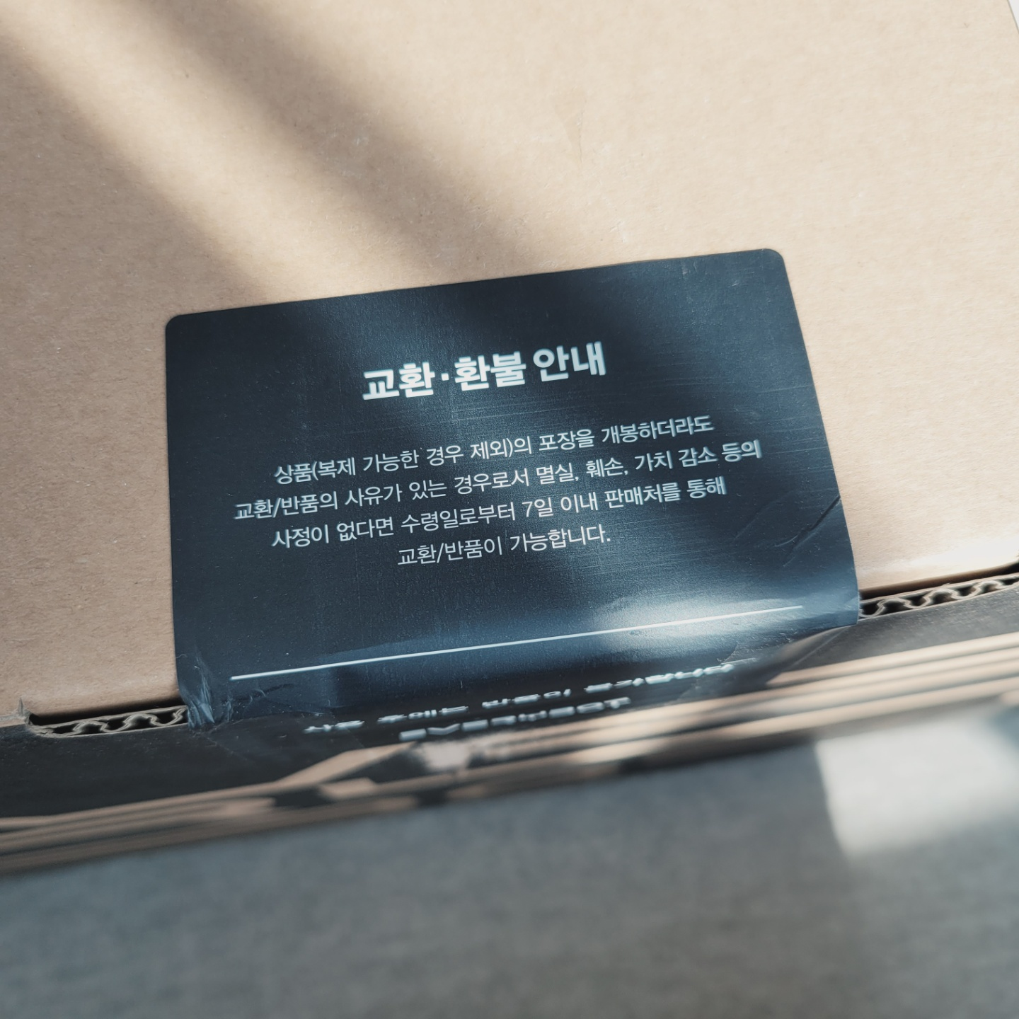 박스에 교환환불안내 스티커가 잘 붙어있다. 7일 이내 판매처를 통해 교환/반품이 가능하다는걸 굳이 이렇게 알려주다니. 제조사가 참 친절하다. 이런 포장을 하는 회사가 많아지면 좋겠다. 없던 신뢰도 생길듯