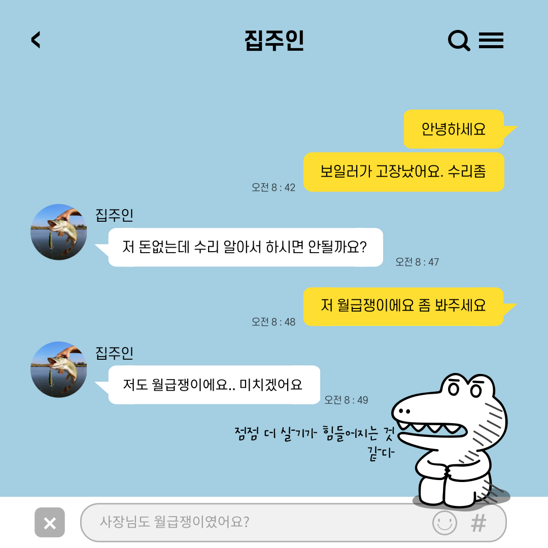 "이제 집수리 못해줘요~ 알아서 고쳐서 쓰세요. 나도 먹고 살아야지~ 임대인이 뭐 자원봉사자에요? 응? 뭐 법이라고요?