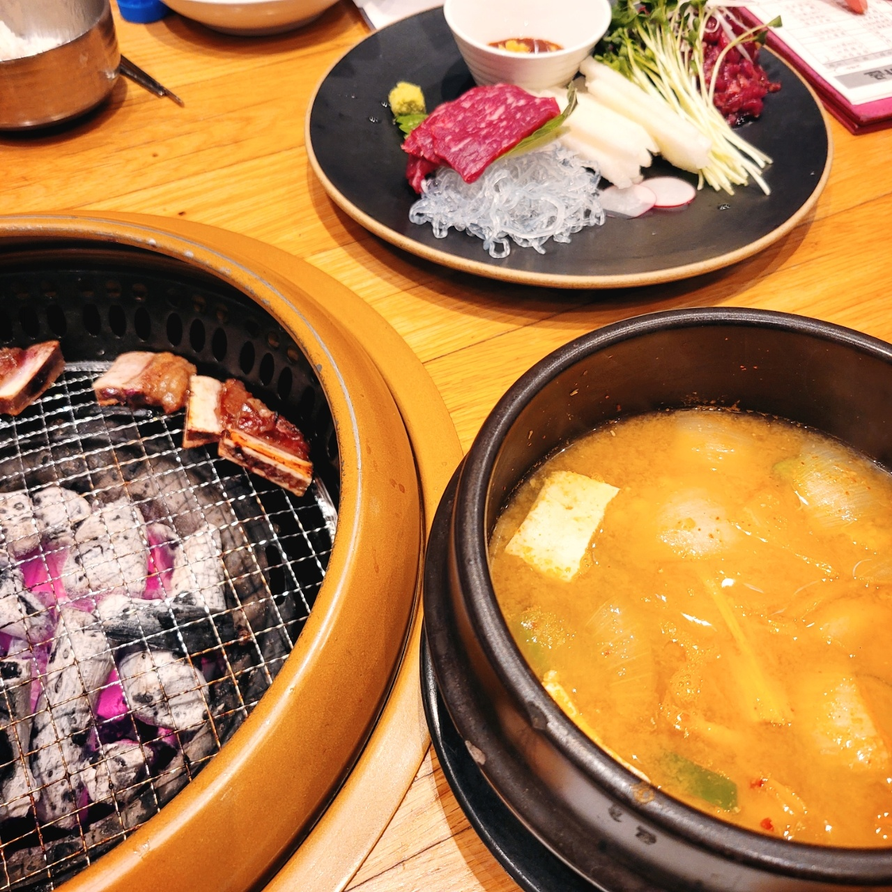 나, 와이프, 딸냄이 같이 갔고 셋다 입이 짧기 때문에 소갈비 2인분과 밥 한공기, 된장찌개 하나를 우선 시킨다. 그리고 소주한병. 소갈비를 어느정도 먹고 나서 육회&육사시미를 시킨다. 이런 도심에서 육사시미를 먹을 수 있다니. 육사시미도 맛이 괜찮고, 육회도 양념이 나쁘지 않다. 먹을만하다.