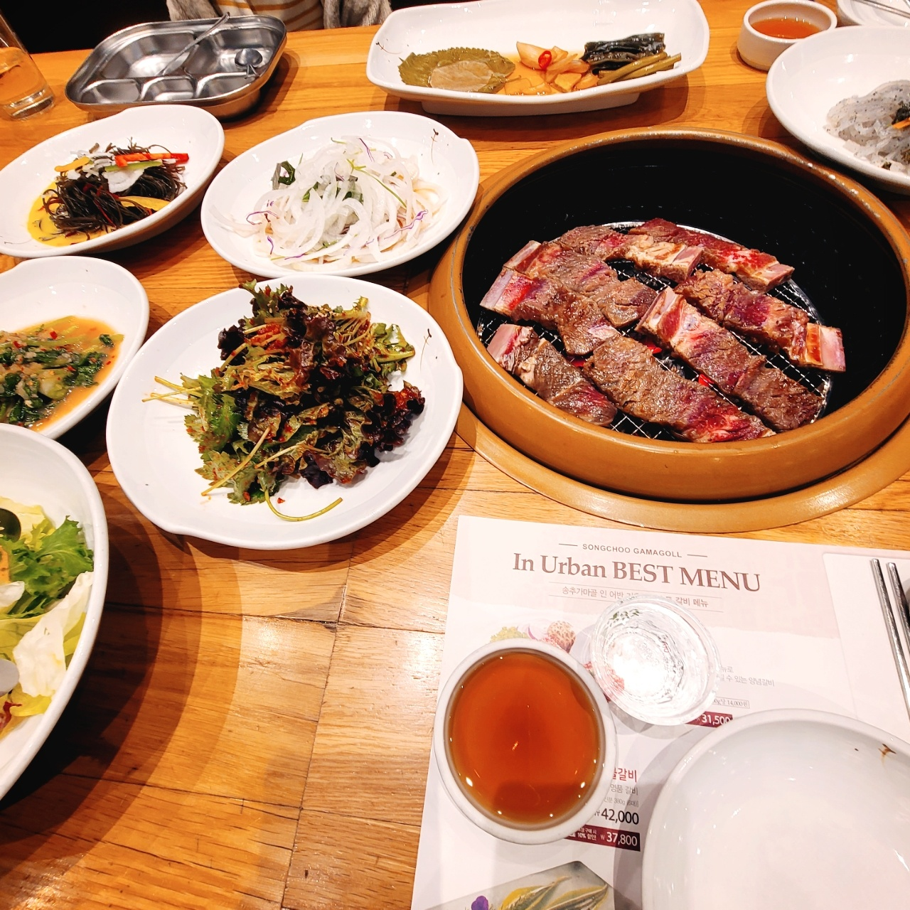 기흥AK에 소갈비 맛집인 송추가마골이 있다. 엄청난 맛집은 아니지만 그럭저럭 맛있게 먹었다고 이야기하며 나올 수 있는 집이다. 그정도면 맛집이지 뭐. 양념 소갈비는 1인분에 39,000원 정도부터 시작인가보다. 더 저렴한게 있었는데 '인기', '추천'이 붙어있는 것 이하를 주문하면 맛이 없을 확률이 매우 높기 때문에 그냥 인기 스티커 붙은 메뉴를 시킨다.